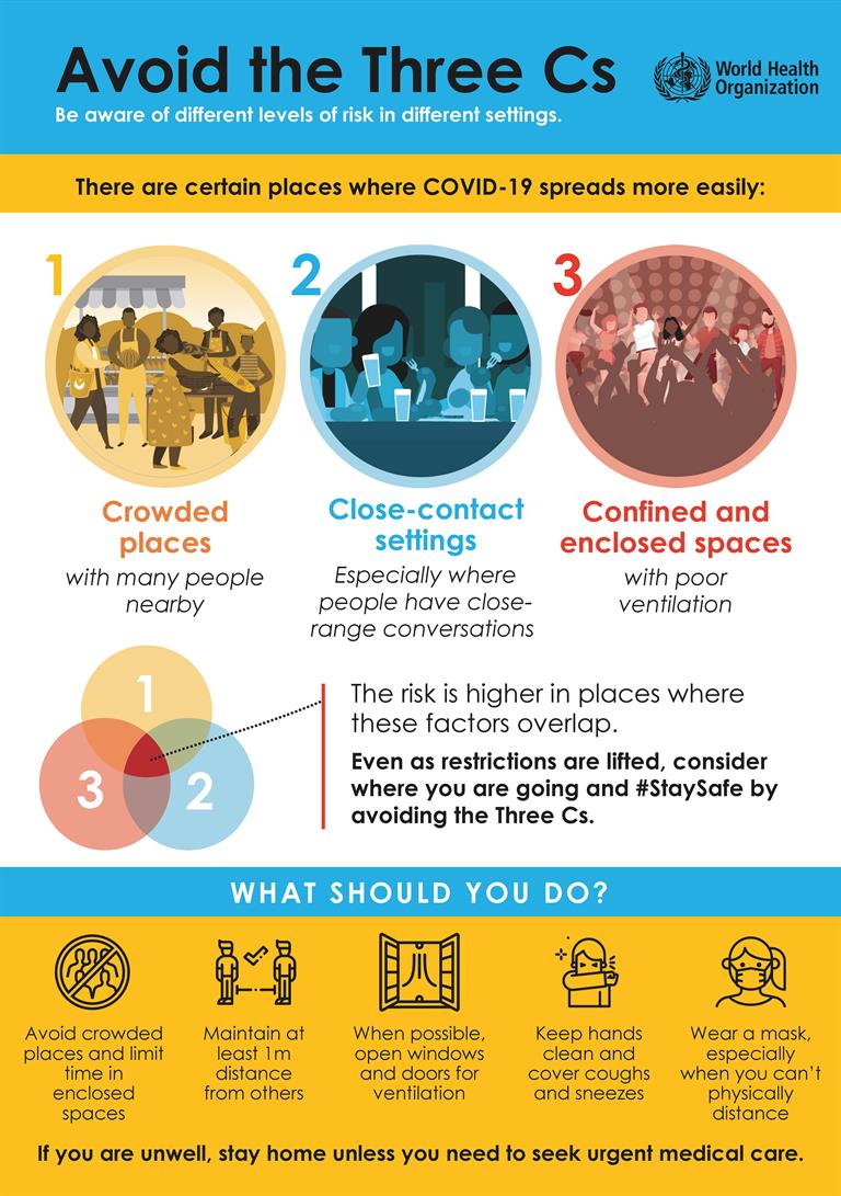The risk of COVID-19 spreading is especially high in places where these “3Cs” overlap.