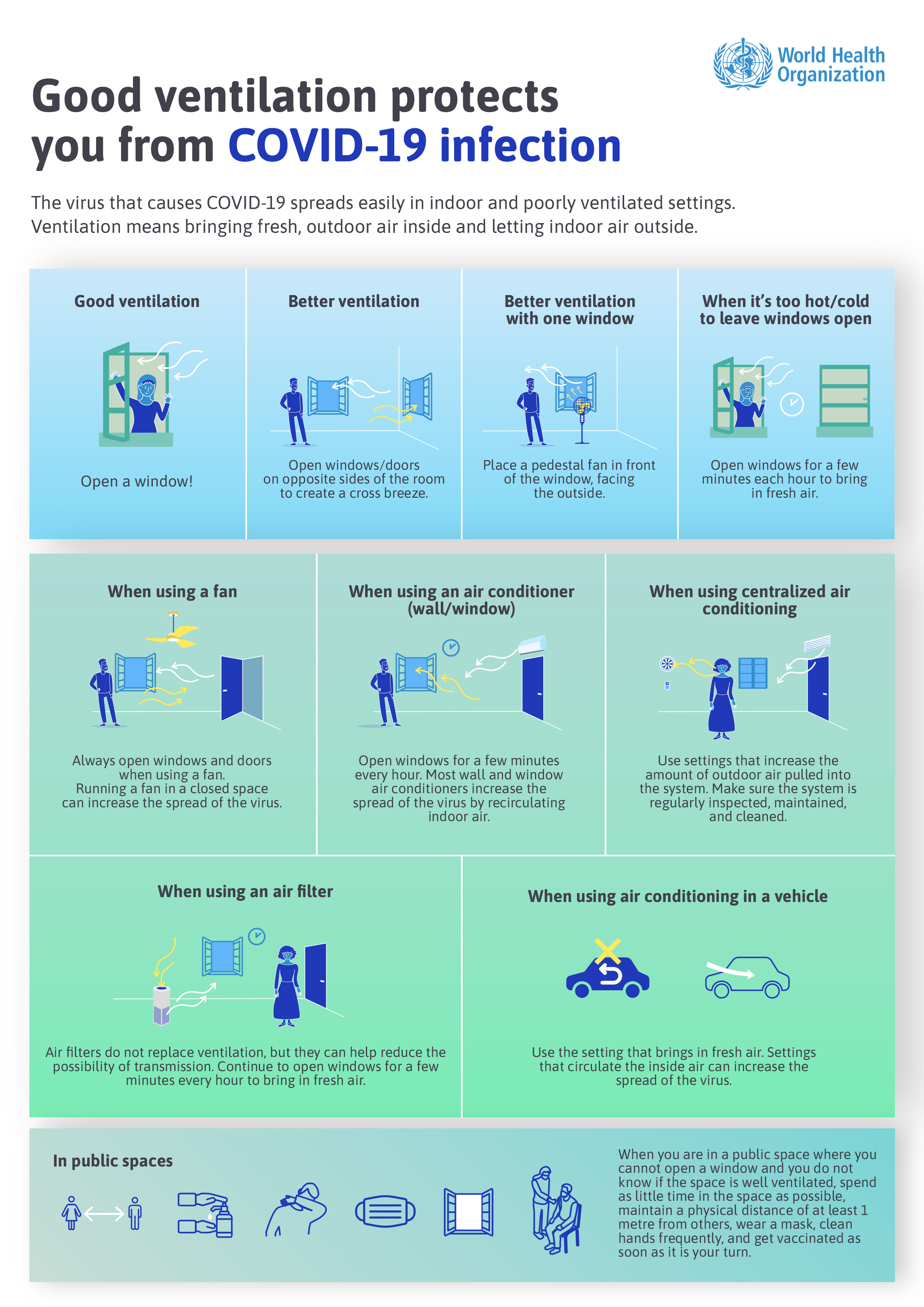 En junio de 2020, la OMS contribuyó a la elaboración de orientaciones sobre los sistemas de ventilación y aire acondicionado en el contexto de la COVID-19, que pueden consultarse aquí. La OMS colabora estrechamente con la Organización Meteorológica Mundial a través de la Oficina Conjunta para el Clima y la Salud, así como con la Oficina Nacional de Administración Oceánica y Atmosférica (NOAA, por sus siglas en inglés) de los Estados Unidos, a través de la Global Health Information Network, con el fin de elaborar y actualizar dichas orientaciones. En 2020 y 2021, expertos de la OMS trabajaron en la mejora de diversas orientaciones técnicas sobre ventilación en diferentes entornos, incluidos centros de salud, hogares, centros para cuarentenas, escuelas y empresas. Además, en marzo de 2021, la OMS publicó una hoja de ruta para mejorar la ventilación en diversos entornos.