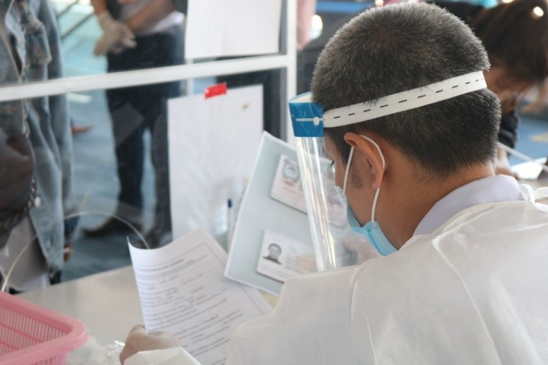 20201120-covid-19-air-travel-health-staffThe health staff checked the completeness of documents from the passengers, including COVID-19 test results taken before departure and the health declaration form.
