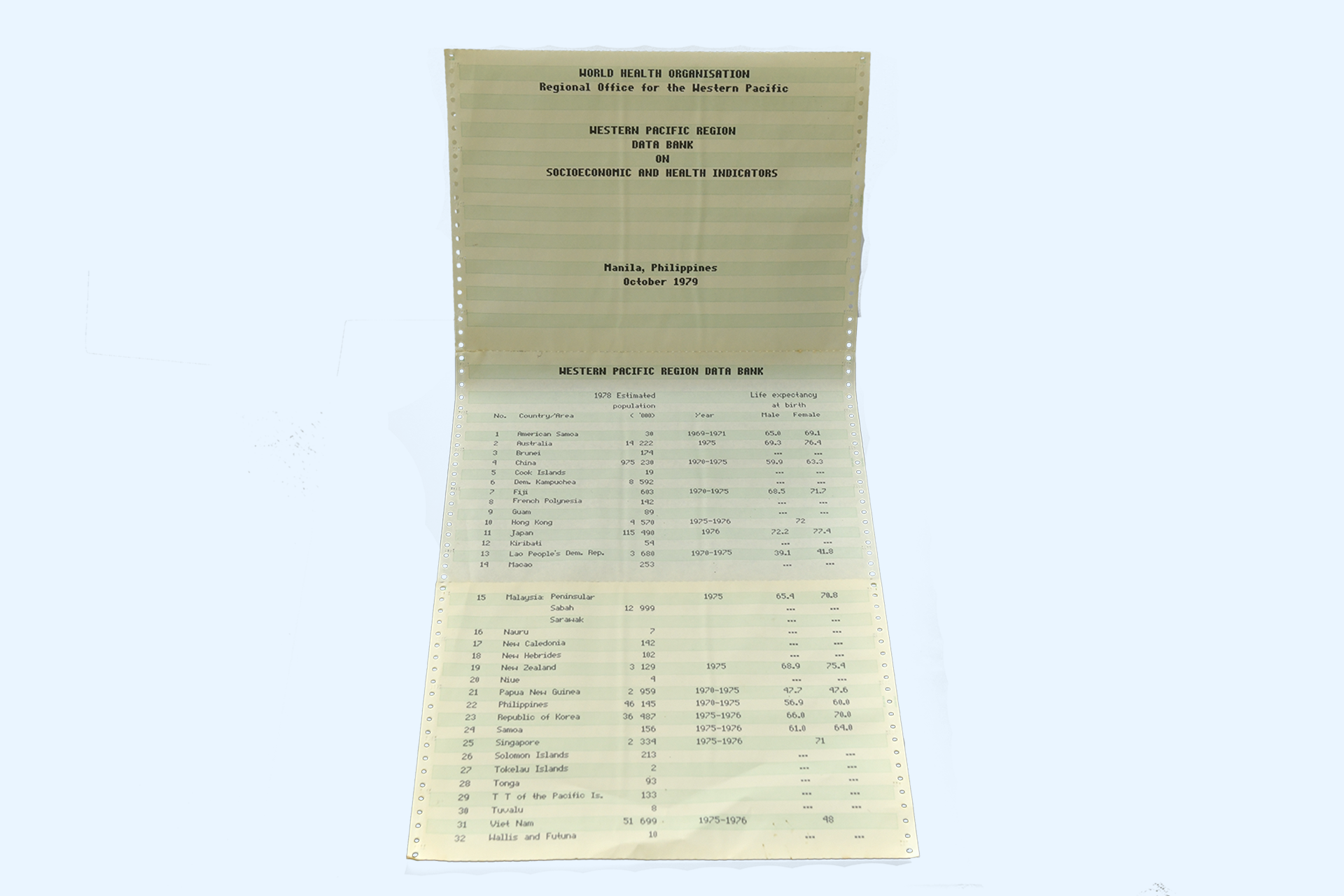 Health statistics from 1979, printed on old paper, represent the WPRO databank for economic, social and health indicators in the Western Pacific Region.